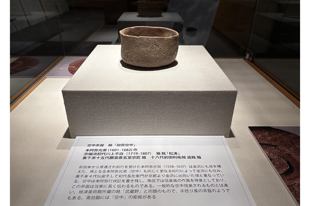 前田家から厚遇され知行を受けた本阿弥光悦(1558-1637)は金沢にも居を構 えた。孫となる本阿弥光甫(空中)も同じく更なる知行によって金沢にも住み、 裏千家4代仙叟そして初代長左衛門が京都より金沢に出向いた頃と重なってい る。空中は本阿弥行状記を書き残し、陶芸では信楽風の作風を得意としており、 この茶盌は当家に長く伝わるものである。一般的な空中信楽されるものとは違 い、根津美術館所蔵の銘「武蔵野」と同類のもので、手捻り風の茶盌のようで もある。高台脇には「空中」の彫銘がある